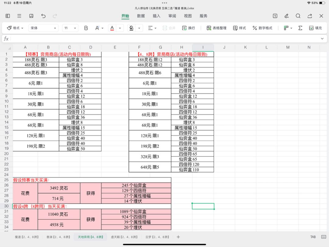 最初版本的表就只是5个活动需要材料的一览表,0氪最喜欢问礼包买满多少钱有多少4倍之类的问题,但真的会有人说吗?网上哪有老实人。我就觉得问别人不如自己做,我把表重做,按5个活动分开做,整理的比较详细,7月底的一次4跨天地弈局,我那时候下棋一次74棋符,用道具「属性增幅」后才92棋符,活动结束后我用我自己的数据去算,我要达到第一名的那个数据需要556个4倍,我就跑去跟家族里的人说我算的要到第一名需要556个4倍符。他们都吃惊需要那么多4倍,咋那么能屯和感叹钞能力。