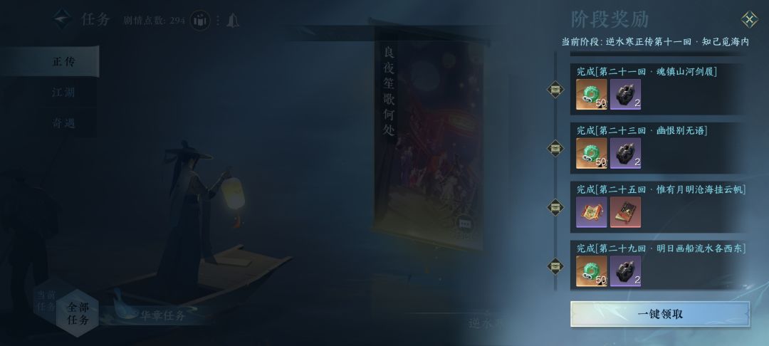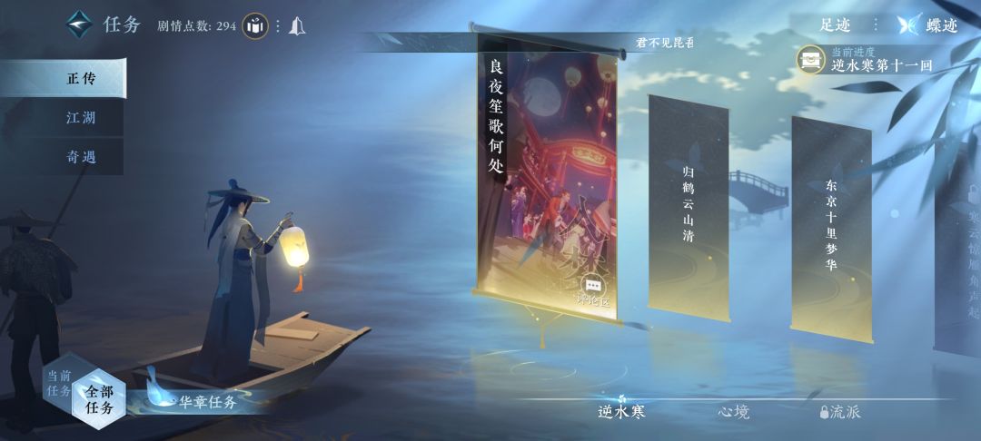 主线任务也就是正传,分为逆水寒和心境,完成所有逆水寒的正传可获得4本虎钤经