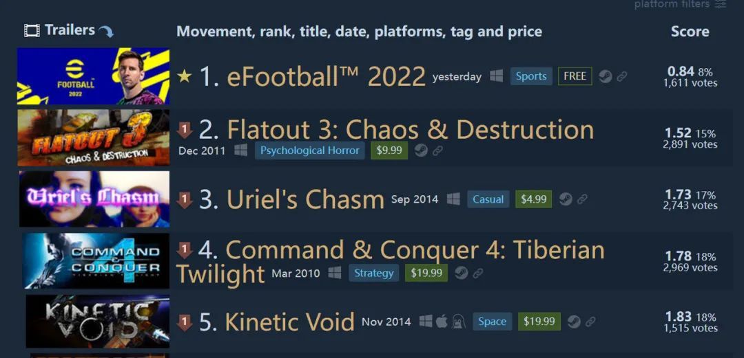 2021年,科乐美宣布下一代《实况足球》将改名为“efootball 2022”,游戏改成了一款免费下载的氪金游戏,删掉了包括大师联赛在内的多个玩家喜欢的单机玩法,在发售前就被玩家骂了个狗血淋头,发售初期更是因为各种离谱的BUG和屎一样的优化,光荣地登上了Steam差评榜第一。