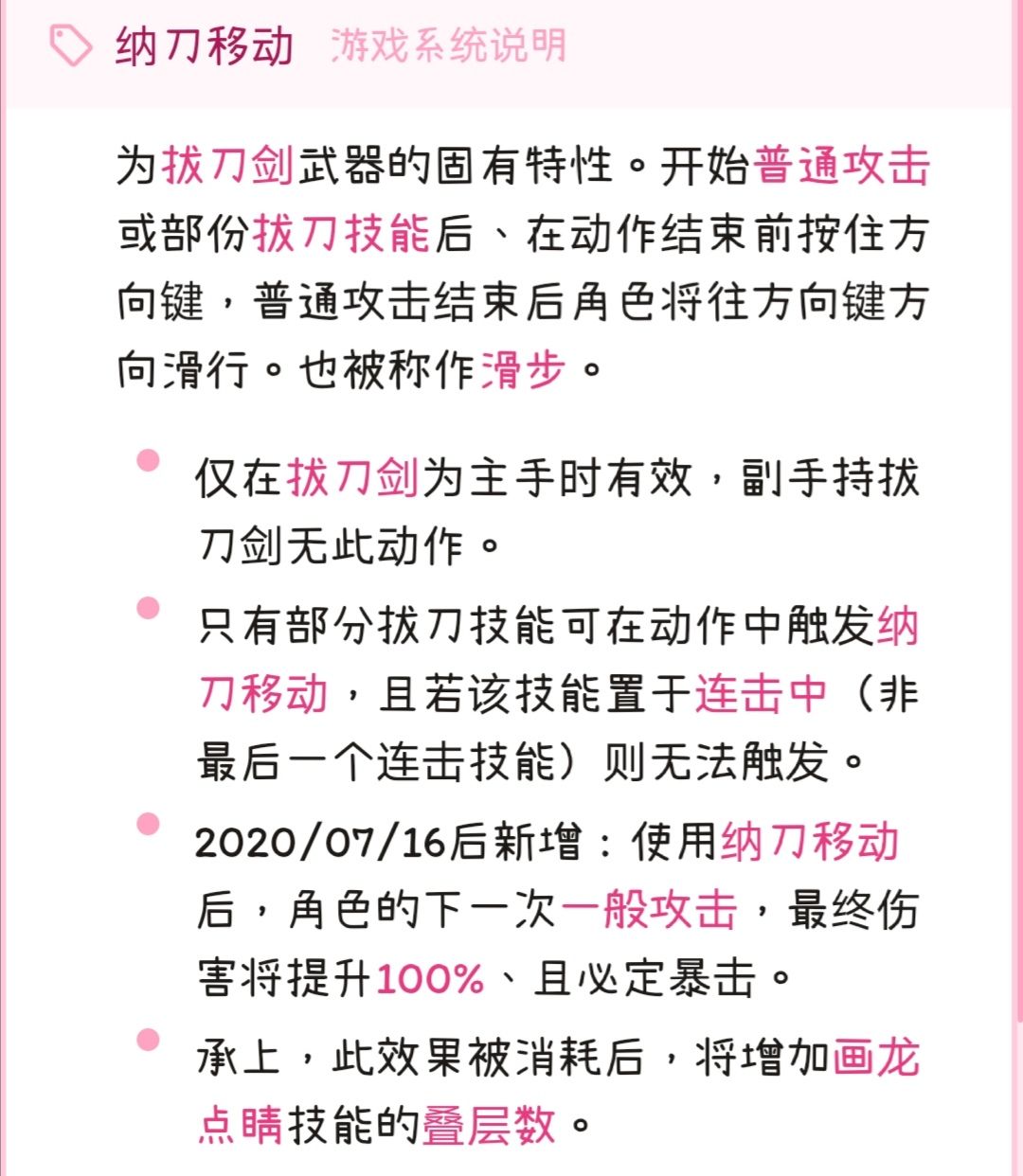 纳刀后会有一个武士道Buff,下一次普攻的必爆且叠加一层画龙层数,这一特性使明镜止水相较于实战中使用情况极大减少,纯拔必要熟练普攻纳刀与技能纳刀。当使用部分拔刀技能结尾断连的时候,同样可以纳刀移动,较常见的有无影斩结尾纳刀。