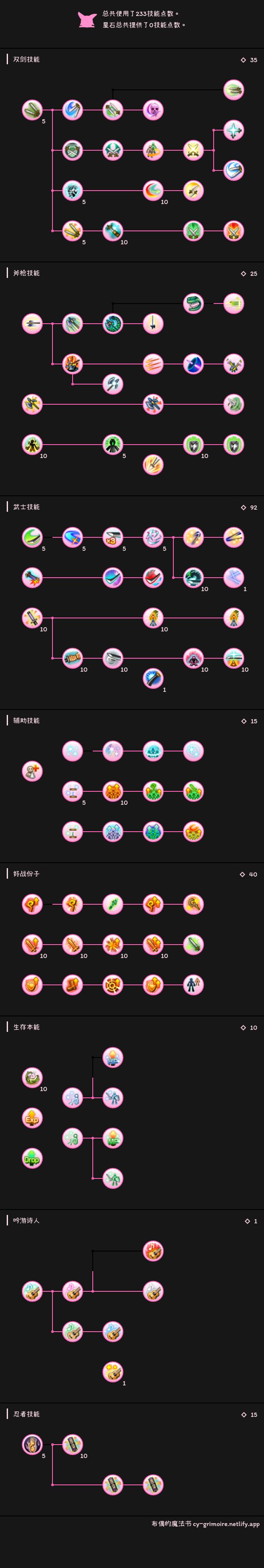 神勇破风行速增伤/双剑buff分支总共提供25%拔刀伤 / 天地斩启动需要无影斩,但倍率受画龙等级影响所以无影可以只点1, 逆境作为场外回蓝能力比较建议点满 (5点)/装死操作够硬大佬请无视 / 明镜止水需点满提供普攻65暴击保证攻回。/起手技不够可考虑治愈之歌(1点)。
