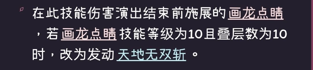 dpⅣ 天地无双斩: 画龙技能等级为10时才会变为无双斩,千万不要先点5画龙点1无影就点别的技能去了´<_`,天地无双惯性伤害会与其启动的无影斩共享一次惯性,必定命中到非必爆,暴击不足仍会白字,降防下增加500技能常数(画龙为1000),实战中并非每次非要斩出天地,伤害足够斩杀的情况下也可以冲击波增幅画龙省点蓝。
