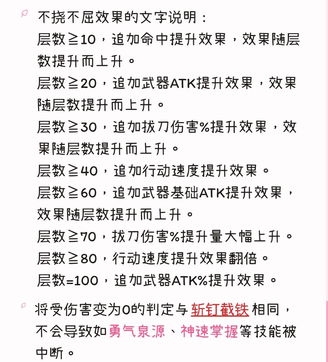 dpⅨ 不挠不屈: 锁王后每两秒叠一层,正常情况下百层共需要3分30秒,但可通过斩钉截铁、弹刀、断祸、霞雪触发反击或减伤额外叠加两层,实际攻击提升仅在20层开始,但除去攻击提升外,需要留意的是50层后纳刀移动获得无敌帧,90层拔刀技蓝耗减半。