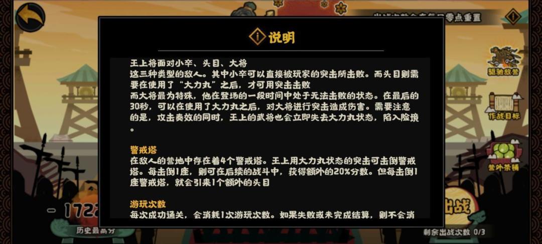 从上面的说明中可以发现玩家们会遇到3种类型的敌人,小兵、头目、大将。对于消灭小兵,最简单的就是普通的突击即可消灭。对于头目,使用普通的突击对头目没有任何杀伤效果,甚至操作失误的情况下会导致玩家们失去一条命。因此在没有大力丸的情况下不要进行自杀式冲锋,保命才是第一要务。而大将在60s至30s期间是无敌状态,即使玩家使用大力丸对于大将也不会造成任何伤害,甚至会被打掉大力丸的buff状态,从而令自身陷入危险境地。因此在大将霸体阶段,不要轻易对着大将使用大力丸进行碰撞。