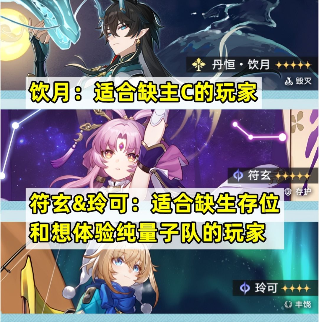 最后提点关于饮月和符玄的选择建议:两个五星角色的定位完全不同,饮月适合缺少主C输出的玩家;而符玄和同卡池的玲可,都是生存位和量子属性,更适合需要补充生存位以及想体验纯量子队的玩家。大家根据自己的需求选择即可~