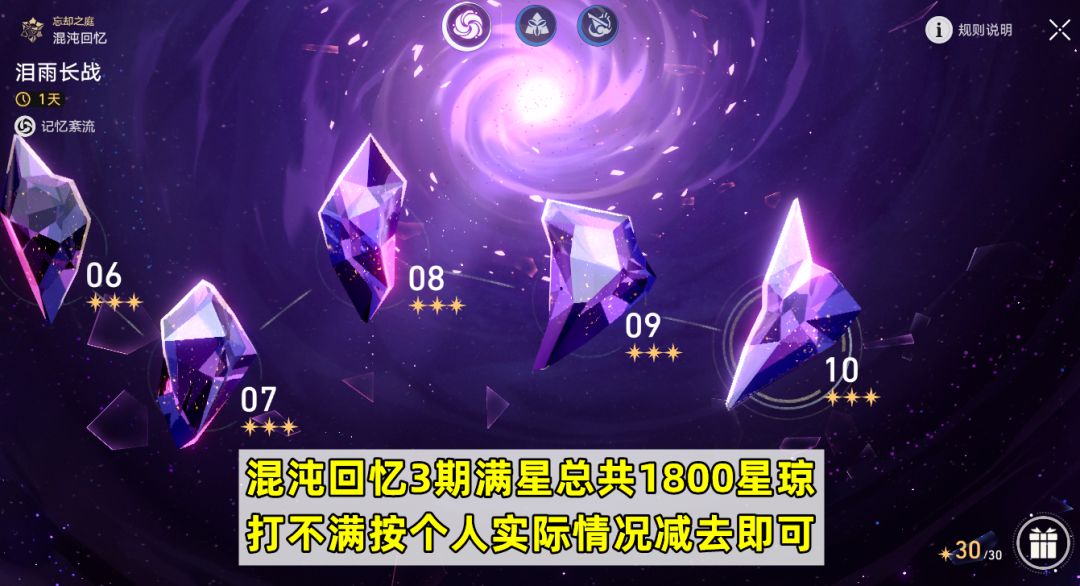 混沌回忆共3期,如果都能拿满星的话总共是1800星琼,打不满的话根据自己实际情况减去即可。