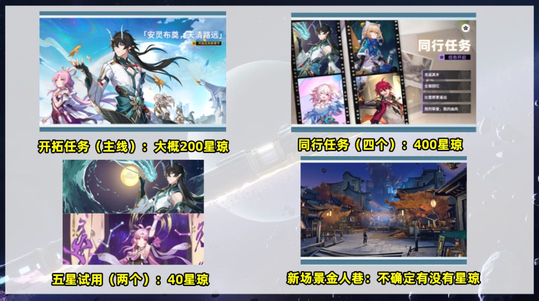 开拓任务也就是主线新增一个章节,参考以往的主线大概有200星琼。同行任务新增4个,总共是400星琼。饮月和符玄两个五星角色试用,总共40星琼。另外1.3还将新增全新场景金人巷,但是目前不确定它是不是单纯的活动场景,以及有没有宝箱,所以先保守计算它没有星琼。