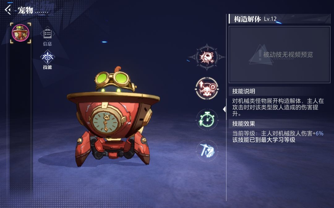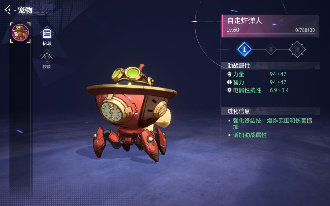 三星满级面板属性和助手鹿角兔差不多,由于两星后主动技能变为释放三个机器人,因此实际爆炸伤害和助手鹿角兔也差不多,这两只宠物就是一对“卧龙凤雏”。被动技能构造解体对机械敌人有 6% 的增伤,打第五章副本时比较好用。(暂不清楚魔棋团本的 BOSS 算不算机械敌人,如果算的话,那么炸弹人的强度还是很不错的。)被动技能马达原理增加 40 冷却速度,和环熠晶狐差不多。