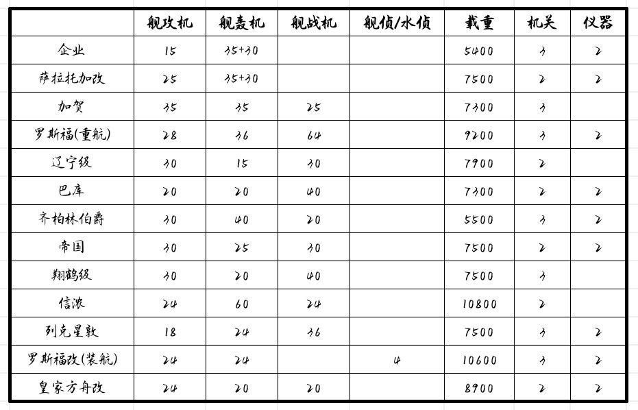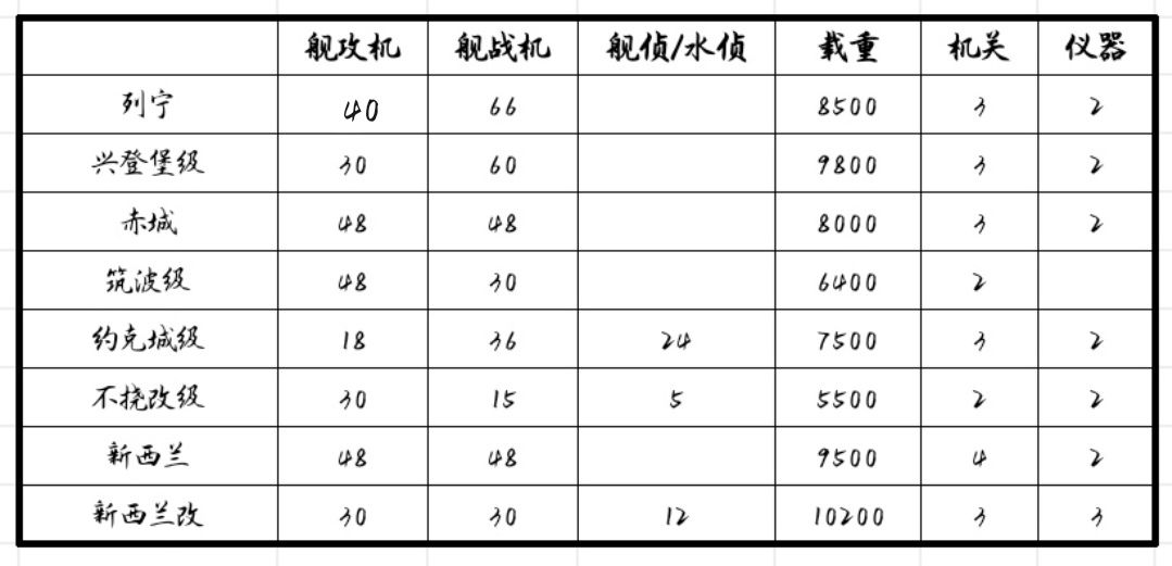 2,不同类航母的强度判定方式不同,但总得来的还是主要参考舰载机数量与载重的配合,不同数量的机关造成的不同航空加成,以及仪器的存在与否等,因此我以表格的形式呈现这些数据,至于强度的判断,就交给各位提督了