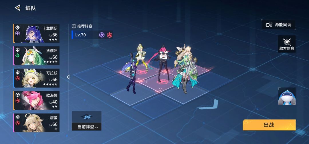 二队是靠熠莹和电枪输出,有灼伤,这个就好打了一些,关键还是盾的占位。看等级就知道,我的歌海娜也没练度,作用就是挂灼伤,方便熠莹输出。练了那个生蕴盾是因为材料好打,有首通,还是保送五星。