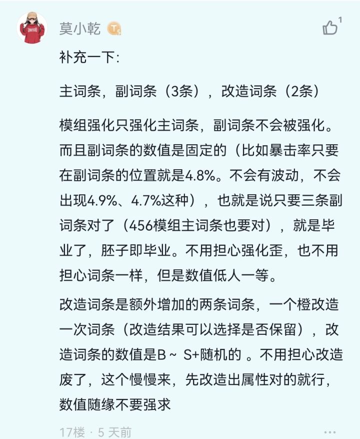 之前随手写的(先看图片一二),理论上这个游戏的模组是比某些游戏好毕业的(点名原神和星铁)。不过因为体力奇缺,不买体力的话基本上就是捉襟见肘,材料本也是消耗体力大头。经过这几天的赌模组,没有一个三词条毕业的,论坛那些三词条的看的我是真眼红。
