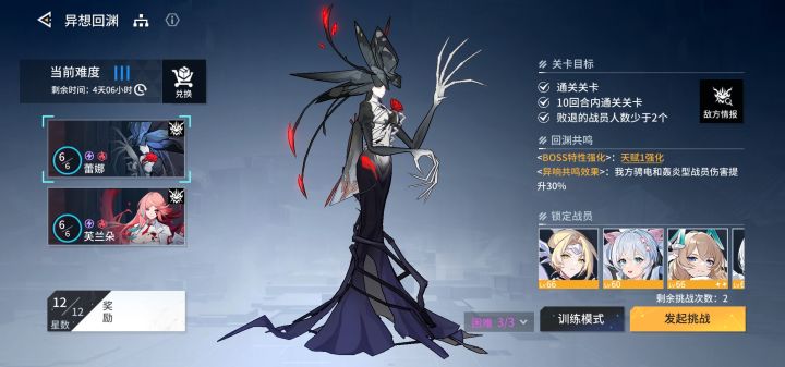 给你们看一下我这期深渊的队伍,养成没拉满(用训练模式打了一下能过,就没有继续养了,去当赌狗刷模组了)。模组因为懒也没换(用的淘汰下来的强化过的模组,伤害是够的),就换了烙痕。