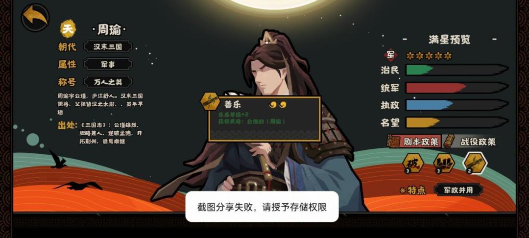 再看三技能善乐,增加乐感2点,在三国剧本解锁武将玩法获得增加20%攻速的武将周瑜。而乐感等级作用也是不太一样的。