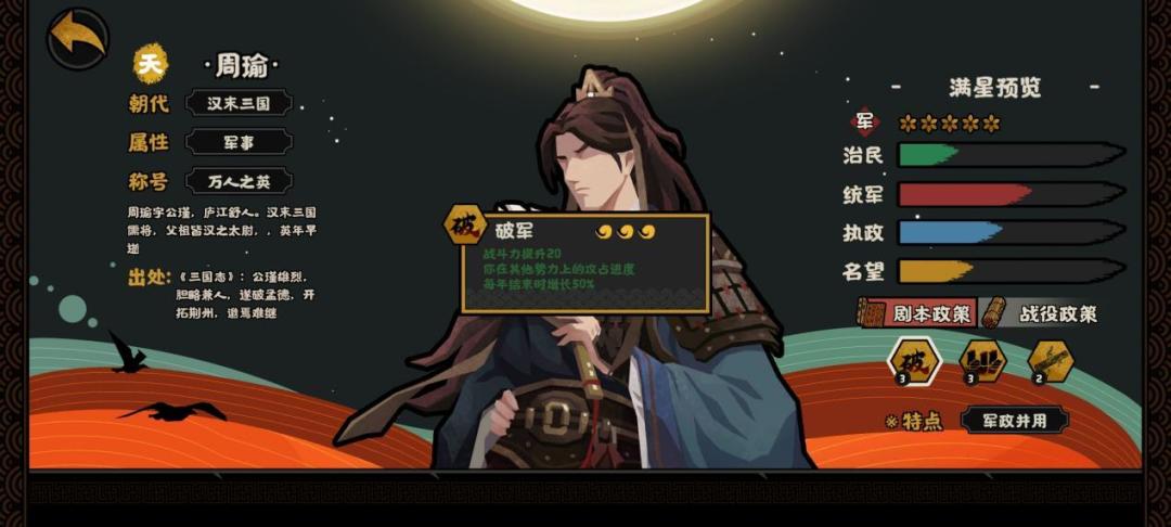 先看一技能破军:加战力虽然才20点,但是后面的条件有些耐人寻味,进攻敌方势力胜利后我方每年会增加敌方攻占进度的50%。相当于敌人打下10的攻占度,在结束后会增加5点进度。之后就是15点进度,每年结束后在加7.5进度,以此类推。个人看来单靠周瑜这项技能只能说是进度增加的慢的要死,但是在东汉和三国剧本中进度增加是极度飞快地。为什么说东汉增加的速度快,因为东汉可以卡烽堡,可以一步登天,周瑜只是锦上添花。而三国剧本中,对于难打的对垒治所,使用周瑜也可以降低自身攻垒的难度。在其他时代中,自动加攻占进度这一条被累战取代,个人表示兵强民富,行动点多,莽夫累战yyds。因此在其他时代中,周瑜该技能的使用性质不算太强,再加上还有用间技能破坏也是可以降低进攻压力。因此该技能本人认为可能会在以后的时代中发挥出它的作用,现在只能说是锦上添花。