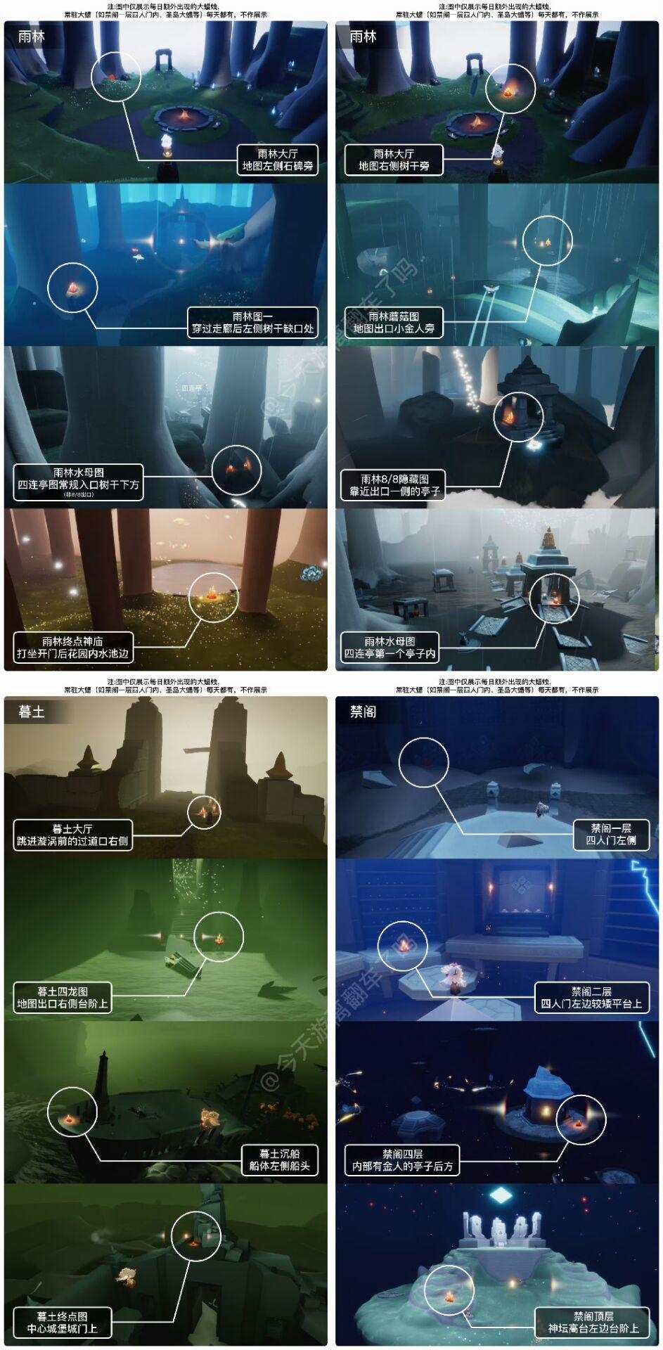 《光遇》游戏中每天的每日任务及大蜡烛的位置都不相同,玩家完成每日任务及收集大蜡烛都可以得到丰厚的兑换奖励,奖励可以用于兑换各种动作及道具,不过很多小伙伴不知道每日任务怎么做,又懒得自己去找大蜡烛的位置,我们汇总了每日任务的完成攻略以及蜡烛位置,一起来看看吧!
