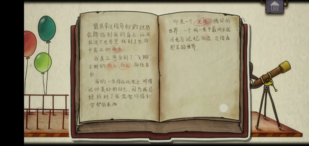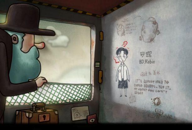 身后的门上方画着行李箱和书钢笔之类的,对应了瞭望台上的东西。而且这些,是不是也可以认为,老鲁比童心未减,依然热爱涂鸦呢?就像十五层的机器那里的涂鸦。