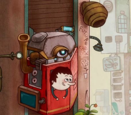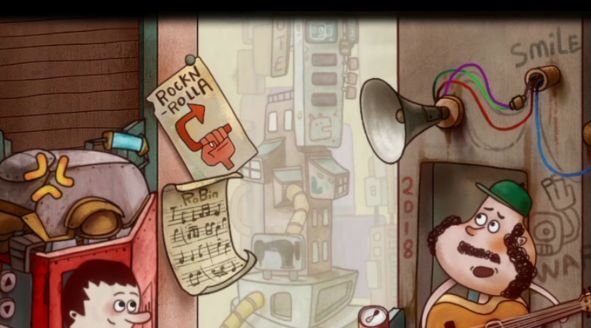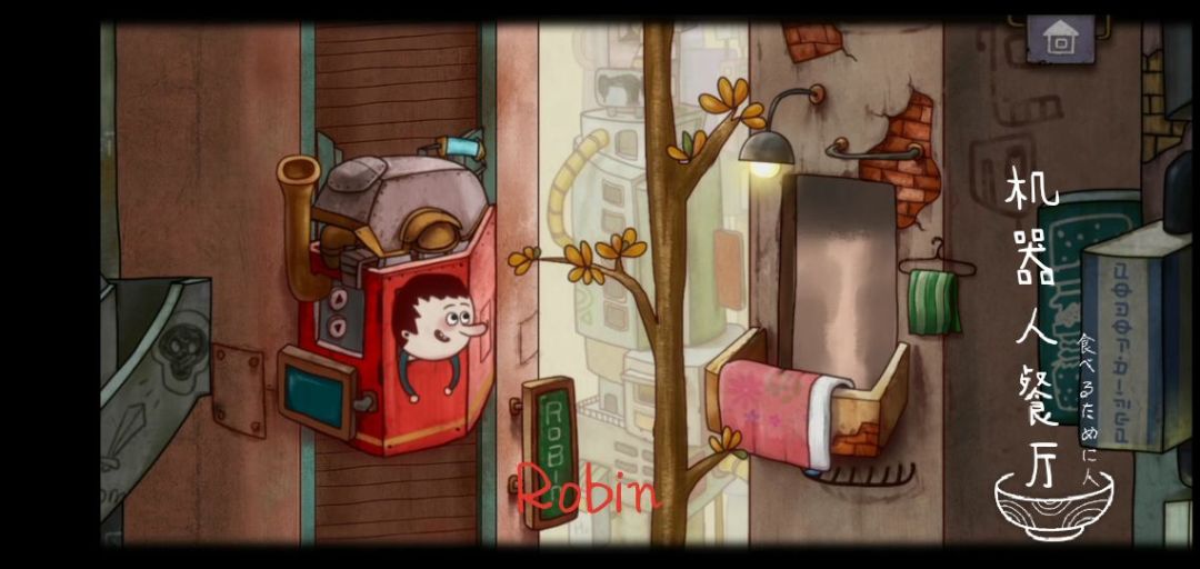 右侧胖布丁文翻译为机器人餐厅,与招牌的汉堡相照应。招牌上的Robin,指美术&设计——罗宾。