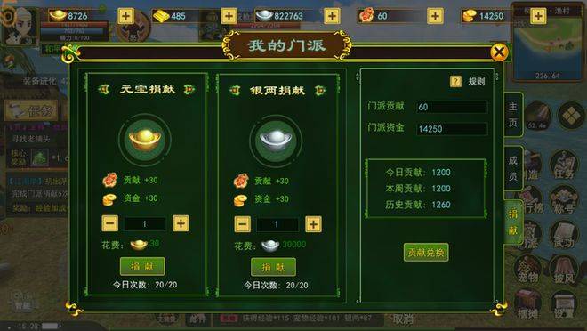 每天有五次的元宝捐献和五次银两捐献,一次捐献可以获得30门派贡献和30门派资金,捐献五次是150门派贡献和150门派资金。购买侠名后额外增加3次门派捐献。门派资金可以用来升级门派等级,现在门派等级最高六级。门派升级需要有一定的门派资金和一定的门派人数,若人数过少也无法升级。门派贡献:可以在百宝阁里面购买门甲、强化石、灵宠技能箱、宠物转职凭证、传送符等等许多重要物资。