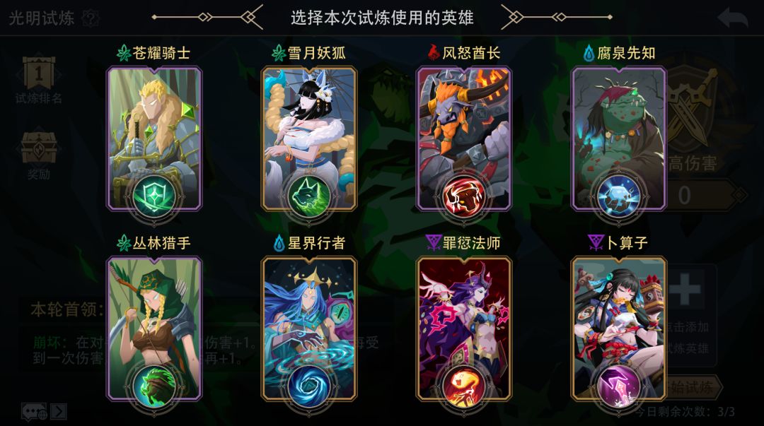 蘑菇补血流:(孢子+树妖+低语者+生命古树+治愈之风等)该常规打法一般可以拿满魔晶奖励,2000分伤害打满需要的条件较高。