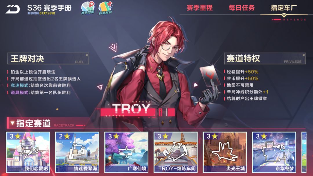 本赛季车厂赞助地图为:我们恋爱吧、情迷爱琴海、广寒仙境、TROY-熔炼车间、炎光王城、京华冬梦、北海渔场、雾山枫吟、天空之城