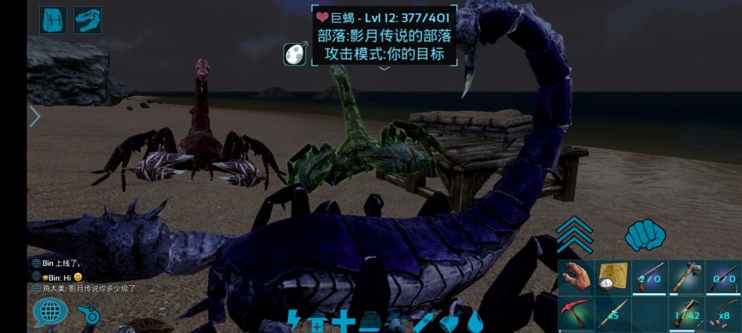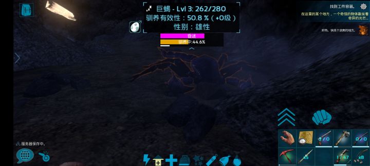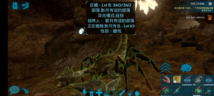 今天带着迅猛龙跑熔岩矿洞,迅猛龙也干死了,我的甲也爆了,第二次看到那群怪聚成一堆堵在路口就想着把他们引开或者逐个杀掉,于是我把几只蝎子引到的洞口附近,用弩打的,打的时候忘了切换成普通箭,就用麻醉箭打的,第一只打晕后,看着能打晕就跑回去拿了麻醉药跟肉尝试驯服,果然能训。于是就用相同的法子引来了另外俩蝎子