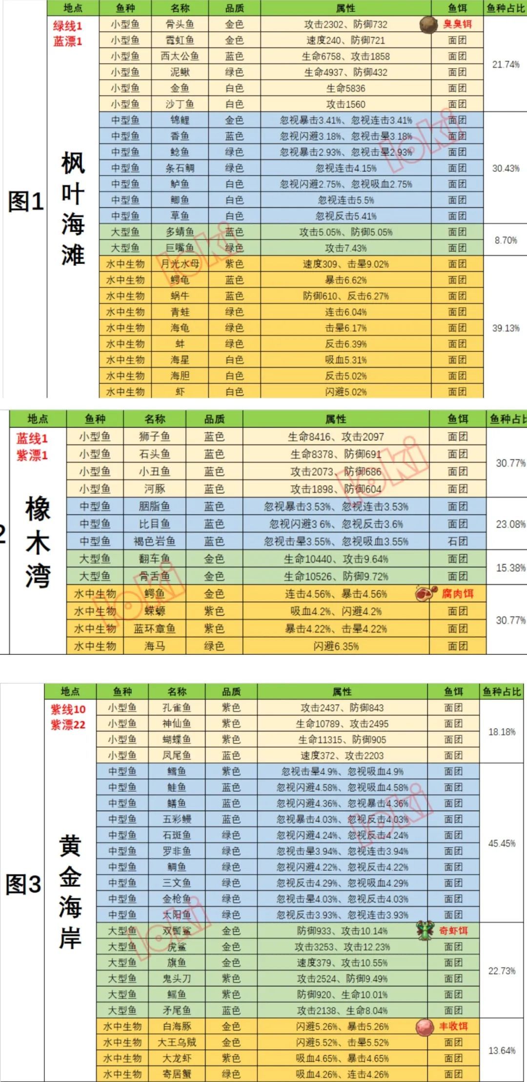 首先是图一到图九的所有鱼的属性、类型、特殊饵等,已经全部列在表里了,这里和小编以前分享过的图鉴版本不同,不过纯粹是因为这版清晰度更高,信息更加直观,感谢贴吧大佬“歌の毒 ” 的分享 。 小编可以确定的是,图中所有信息都是正确的,如果你用了对应的鱼饵钓不上来鱼,纯粹是运气问题。另外图中只给了各个图对应的线漂要求,因为鱼钩不会影响钓取成功率,鱼竿则是因线的等级上下浮动的。