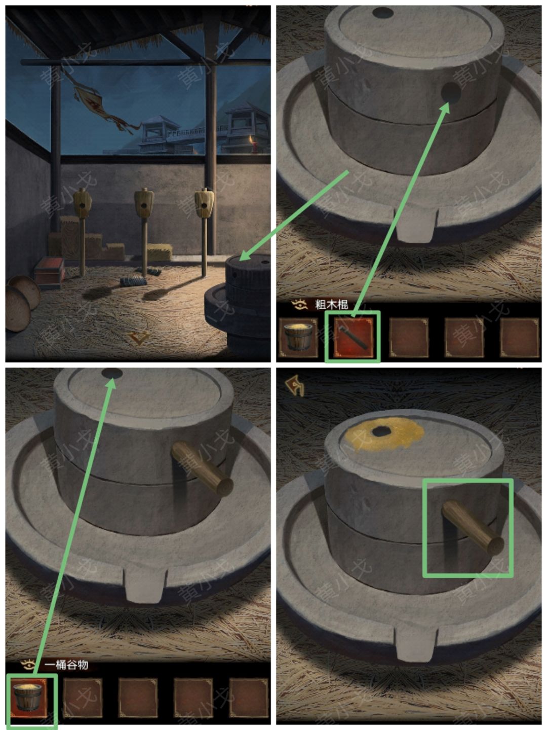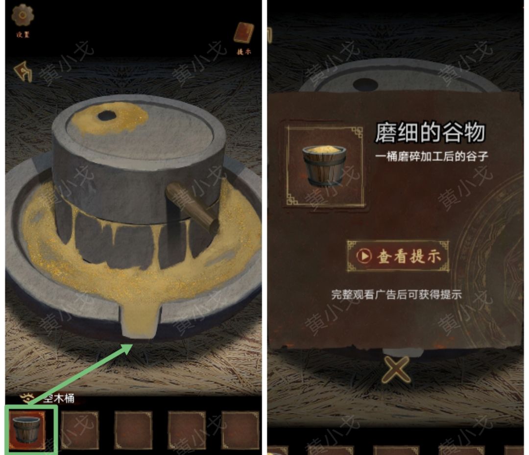 5.点击石磨,插入【粗木棍】,倒入【一桶谷物】,点击木棍研磨