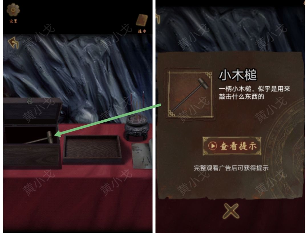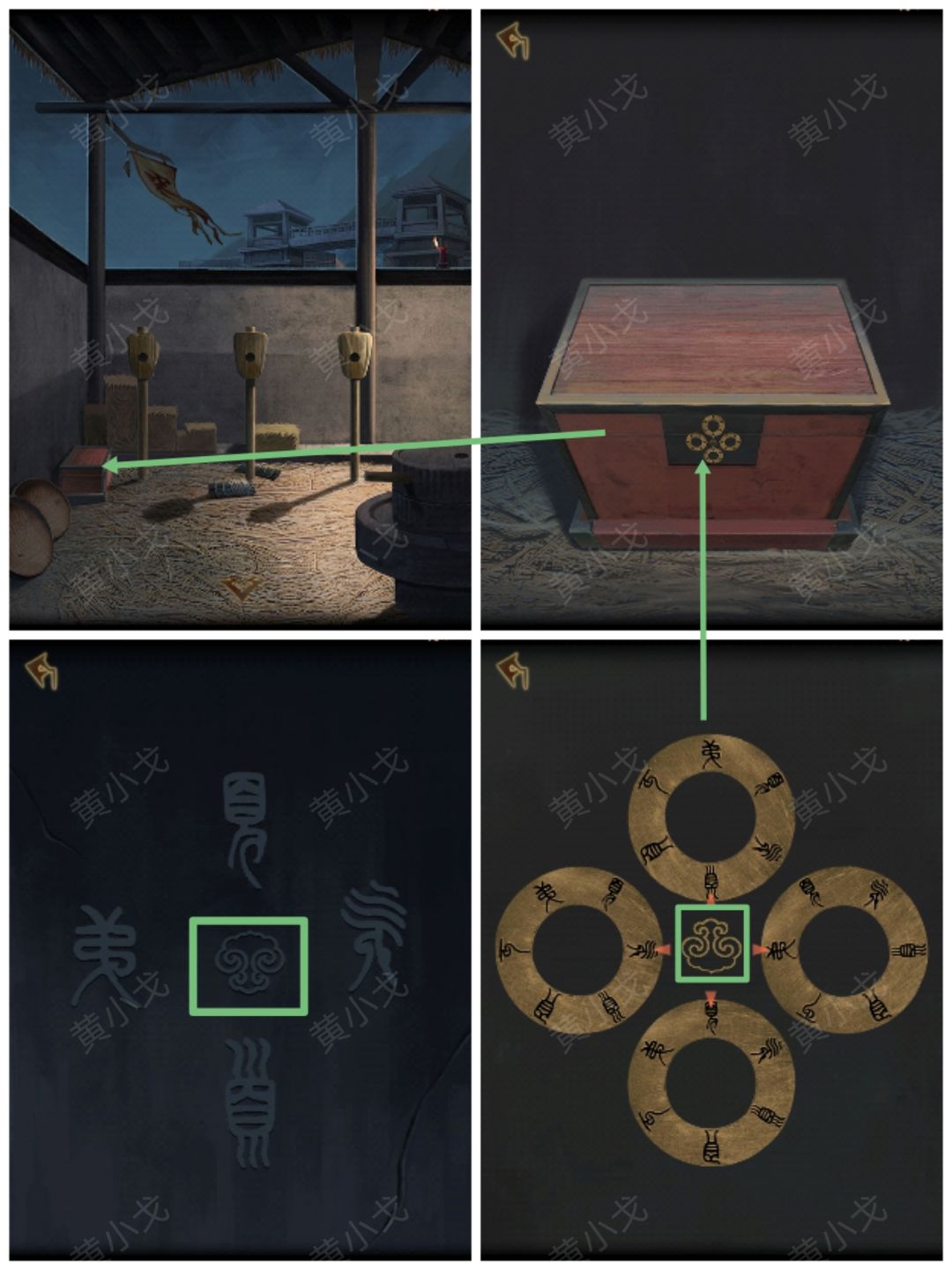 8.(马厩-右)点击箱子,根据左边墙上的线索,调整密码锁(注意中间的图案是倒着的)