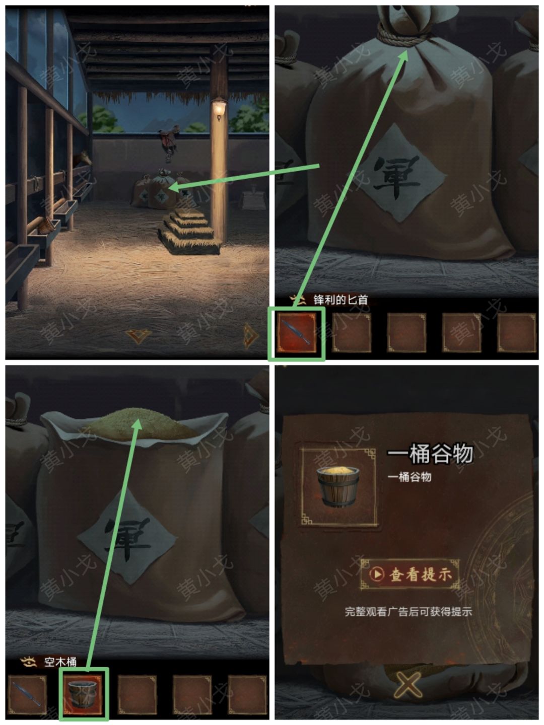 3.点击粮食袋,用【锋利的匕首】割开绳子。用【空木桶】装食物,获得【一桶谷物】