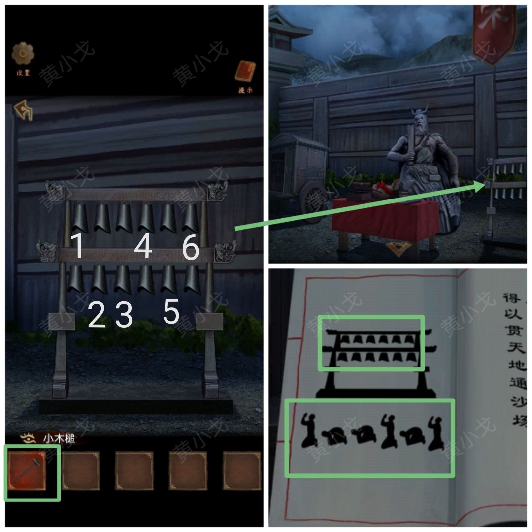 20.点击编钟,根据书上的线索(比较高的人表示第一行编钟),用【小木槌】敲编钟(高-1、低-23、高-4、低-5、高-6)