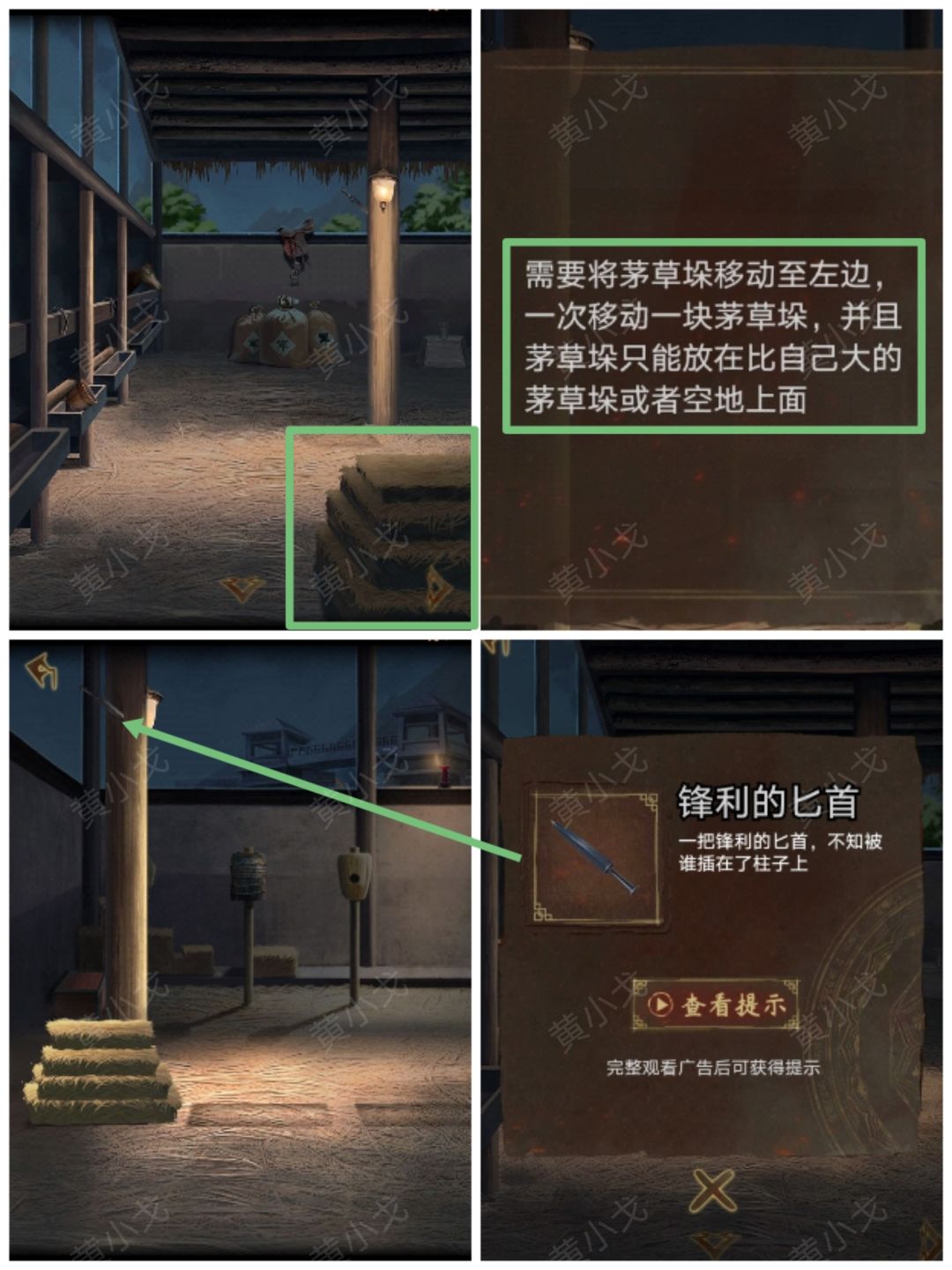 1.(马厩-左)点击草垛,查看游戏说明,完成移动草垛小游戏。在柱子上获得【锋利的匕首】