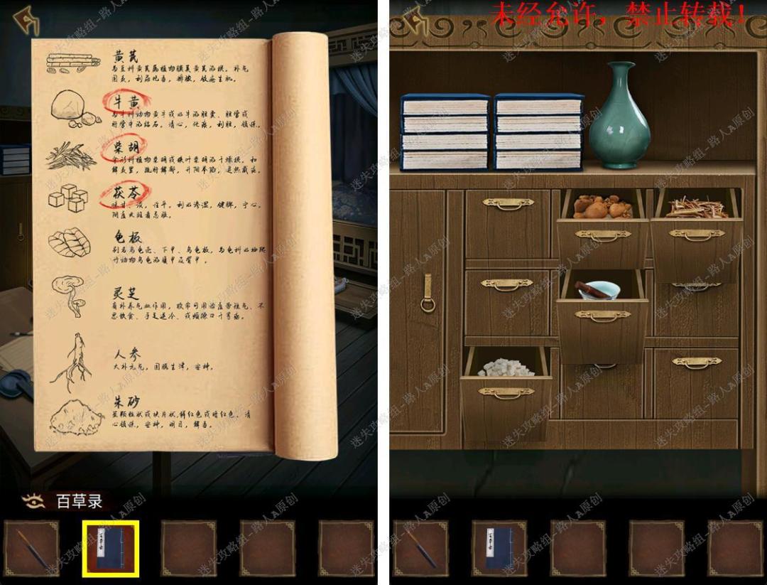 2.根据百草录的线索,在药柜取得【茯苓】、【牛黄】、【柴胡】、【火折子】、【空碗】。2.1
