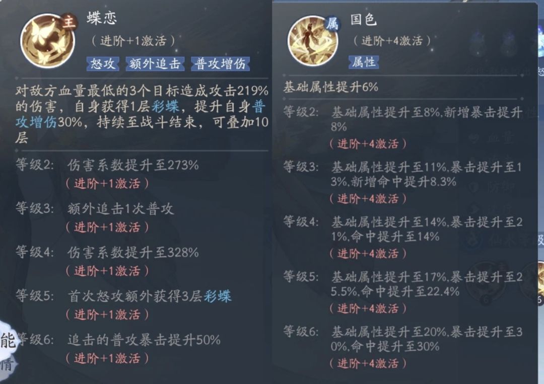 土彩依被动戏蝶,在怒气不满1000的,可以扣除6%-15%血量为代价,增加250怒气