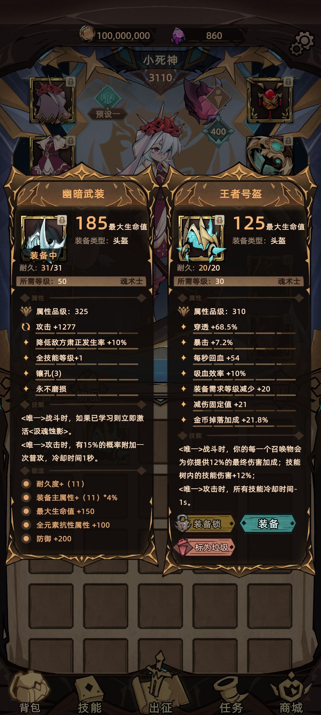 头盔我现在用的左边这个,高基础攻击在强化不高的情况下提升特别高,我带上这个攻击也才2700。后续武器强化,剑伤宝石都齐全了换右边这个,重点是技能的第一条,带两个宠物有24%的最终伤害加成和24%的技能树技能伤害加成。