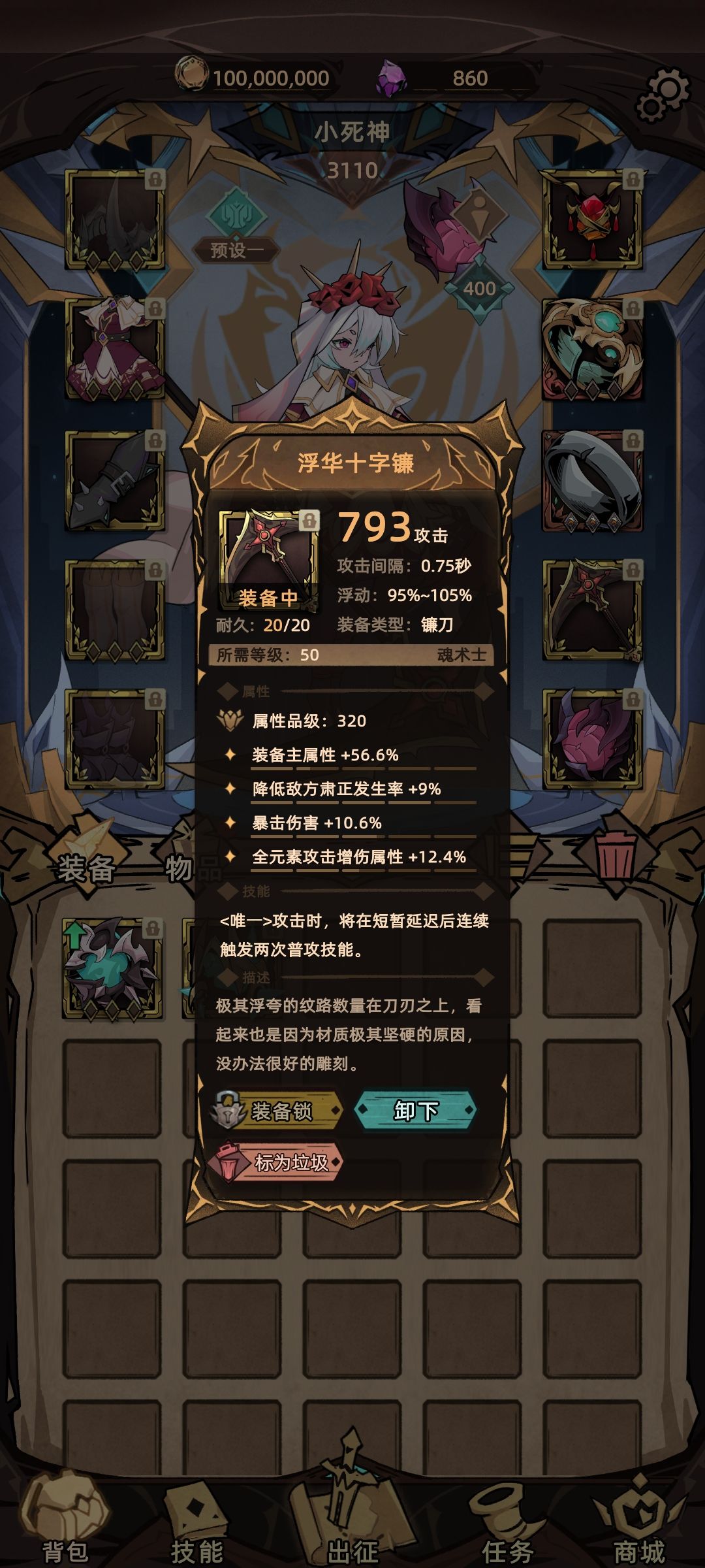 浮华十字镰,技能无敌,每次普通攻击触发3次普攻技能。后面换上套装联动更狠。