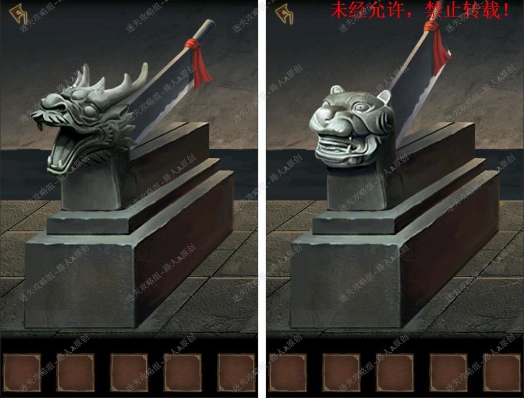 105.将【虎眼】放入虎头铡,将【狗眼】放入狗头铡,根据两侧柱子的图案高低位置,调整三把铡刀。105.1、105.2