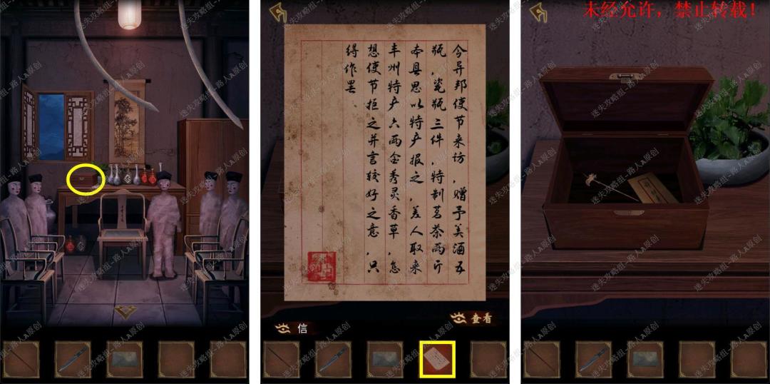 84.拾取木盒下的信件,根据信件的线索(桌子上下的物品数量代表密码顺序),输入密码【六二五三】打开木盒,取得【金簪】。84.1