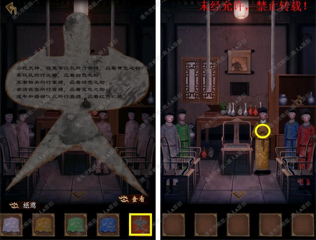 88.用【湿抹布】擦干净椅子,根据纸鸢的线索,给5个纸人穿上对应的衣服,取得【吕知县的令牌】。88.1