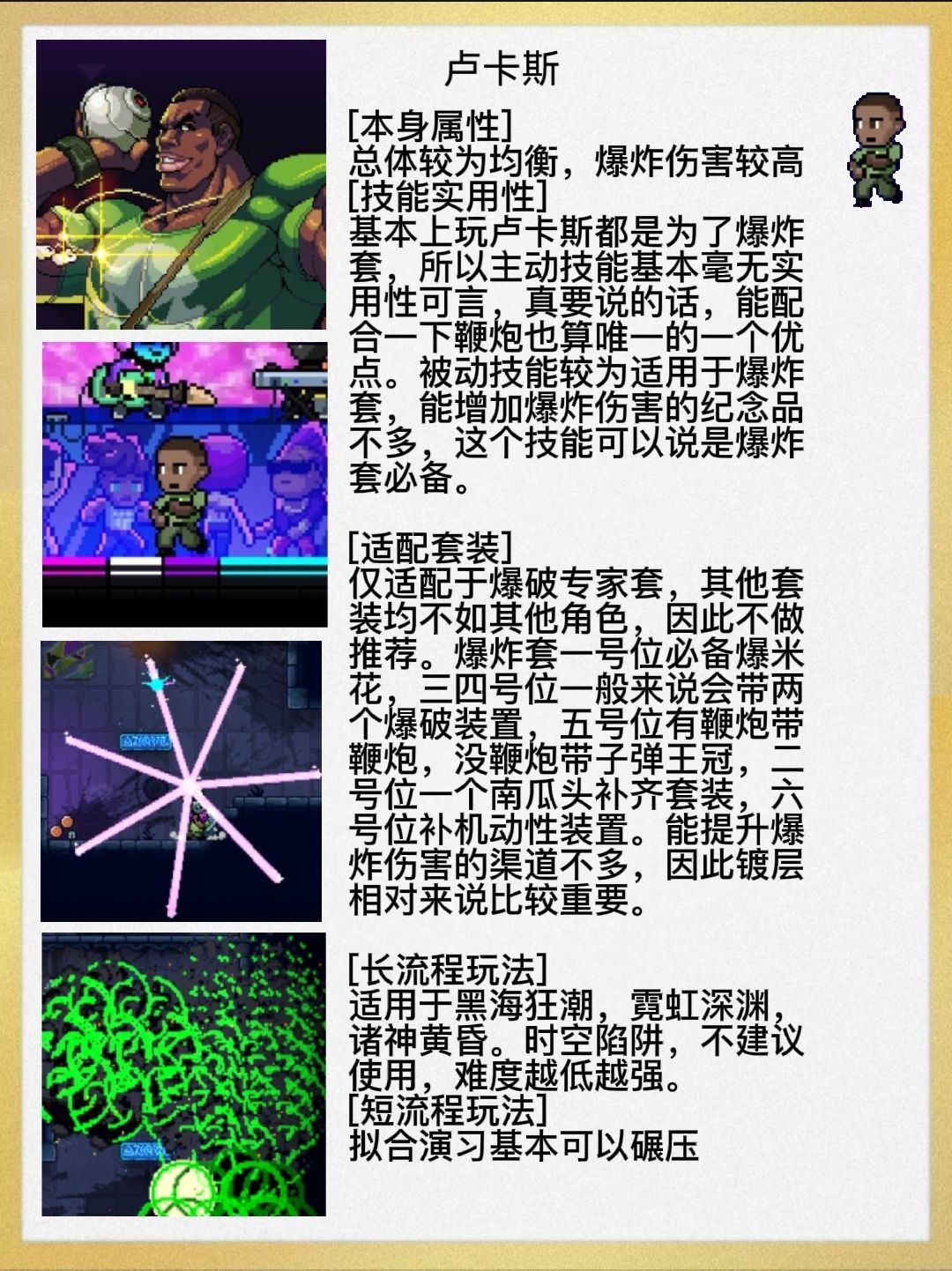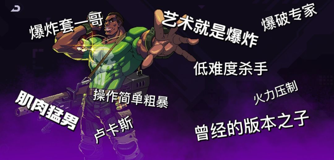 卢卡斯,不错的初始攻击力,但因肤色加成,天生遭队友嫌弃的命,被动技能可以增加自身造成的爆炸伤害,因此基本和爆炸套绑定,看见老卢就等于看见了爆炸套,手游的爆炸套评价极端,众说纷纭,总之就是自己可以玩,队友不行。主动技能可以无限放置定时炸弹,在手游里作用基本可以忽略不计。推荐爆炸套,伤害远高于其他角色,卡是真的卡,吞也是真吞,但短流程玩法里爆炸套依然拥有相当高的地位。