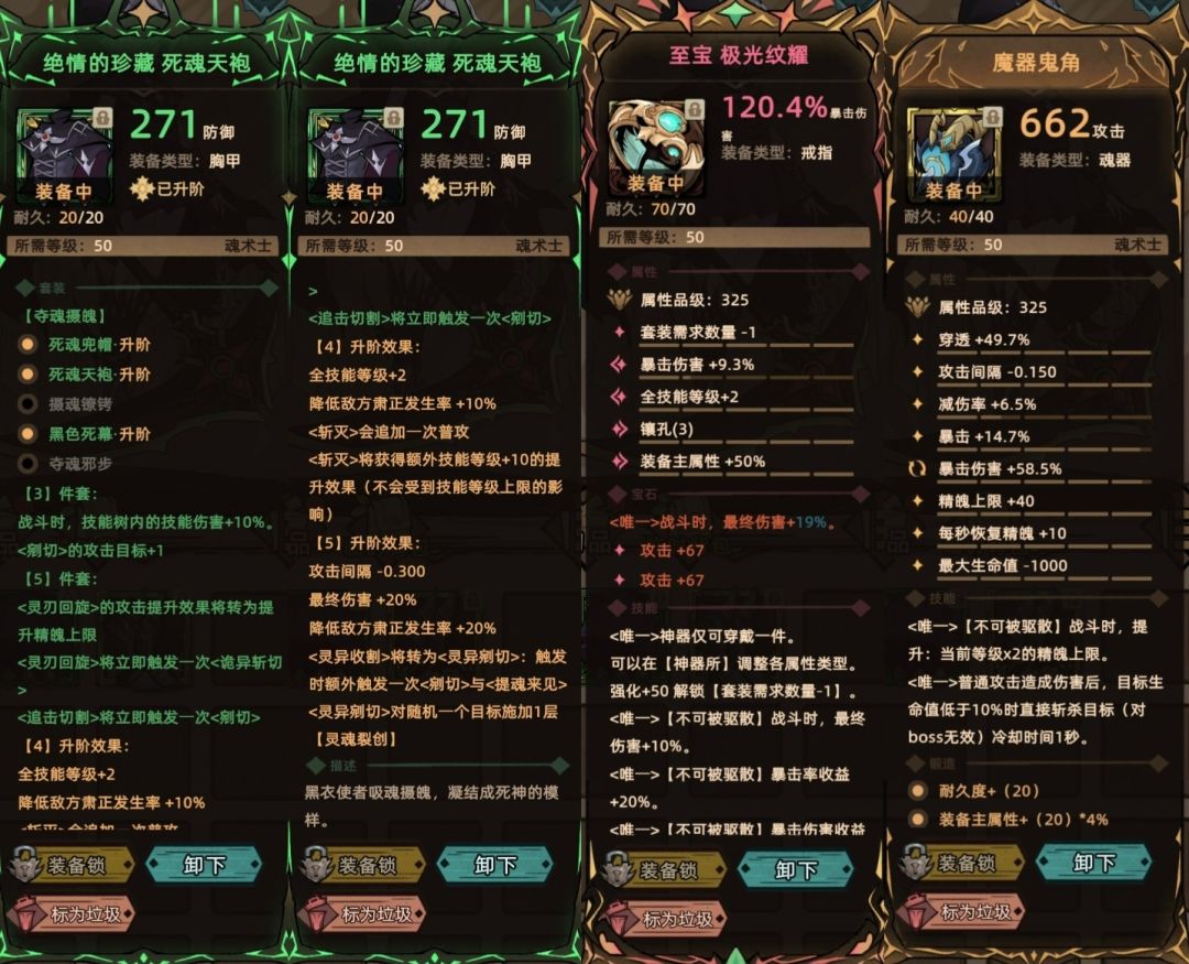 项链-亡魂结晶体:由于死神不缺暴击,无需神选项链,因此选择最高提供20%终伤和20%攻击的亡魂结晶体。
