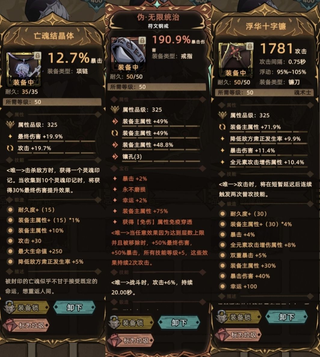 戒指-伪无限统治:最适合死神的戒指,配合死神技能,几乎全程触发。推荐词条三主。
