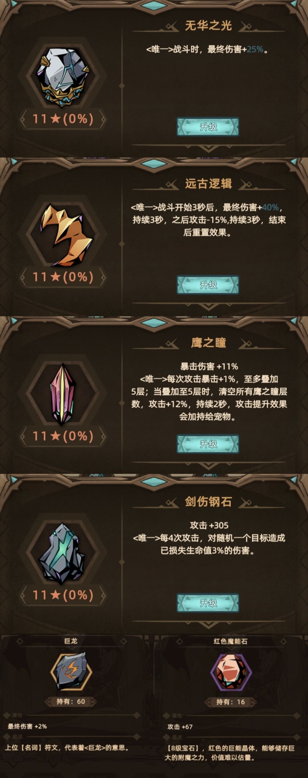 传奇宝石选择无华之光、远古逻辑、鹰之瞳、剑伤钢石,剩余镶孔选择+2%终伤符文或者+67攻击宝石。