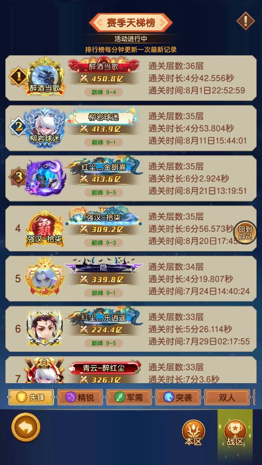先锋-赛季天梯榜:【9-4 醉酒当歌】443亿战力 通关36层用时 4分42秒