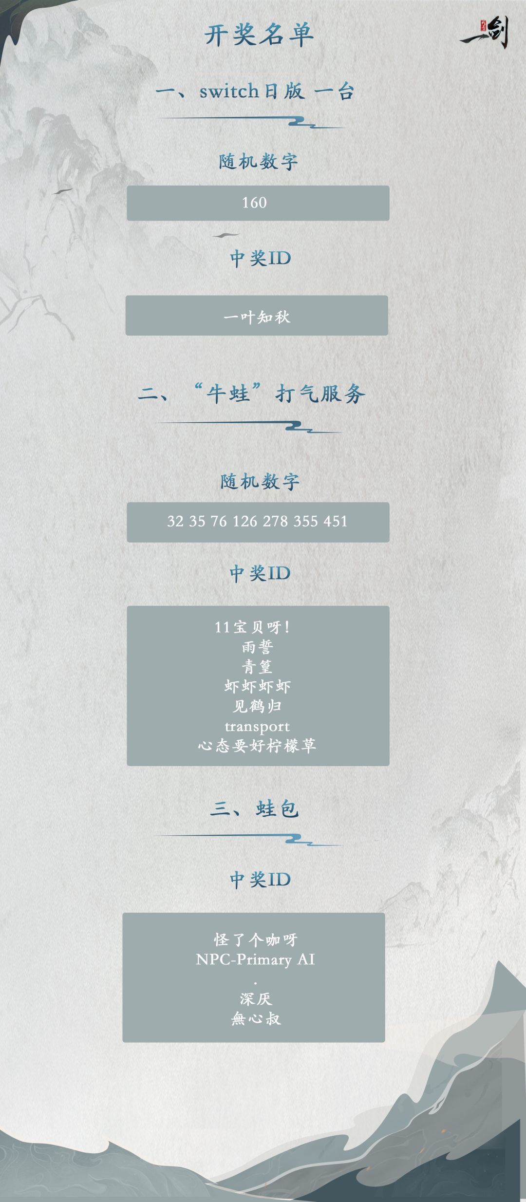 恭喜以上仙友获奖!请加官群817769115并添加小蛙客服QQ:2524033812,进行后续的发奖事宜哦~(注:原获奖者因疑似刷屏,已做更换,希望大家遵守游戏规则,继续参与后面的福利活动哦)