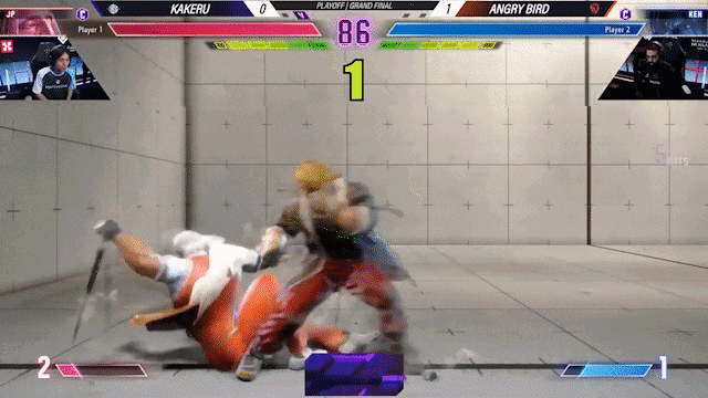 这不是普通的踢击,传统格斗游戏分为上段攻击和下段攻击,AngryBird选择的是能打败蹲下防御的上段攻击(Overhead)。大多数玩家在被逼入困境时会采用更安全的下蹲防御,AngryBird正是瞄准了这点,果断出击。