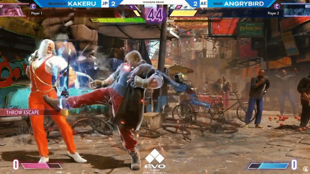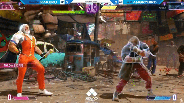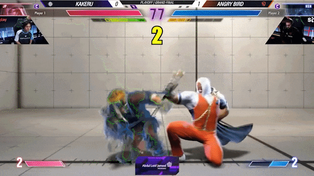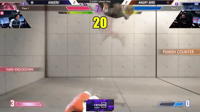 这是一场不久前的比赛,Kakeru和AngryBird再次在一场职业邀请赛的总决赛上相遇。Kakeru针对肯的修炼在于「完美格挡」(Perfect Parry)上。因为肯有一招很难处理的「龙尾腿」,是一个突进技能,虽然前摇比较长,但是后摇特别短,在这招被对手防御后,还能比对手率先行动,能缩短距离后持续施压,是全游戏最厉害的招式之一。