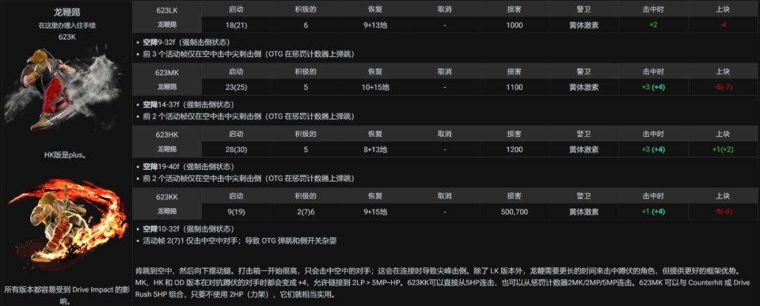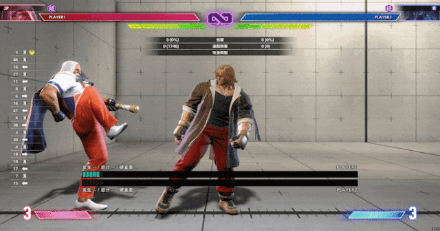 「街霸6」提供了一个能显示所有动作的帧数表,我们能从数据看出,Kakeru防御下冲刺踢击后,能比对手先3帧行动,而他的踢击启动是8帧;肯的轻踢击更快,只需要5帧。