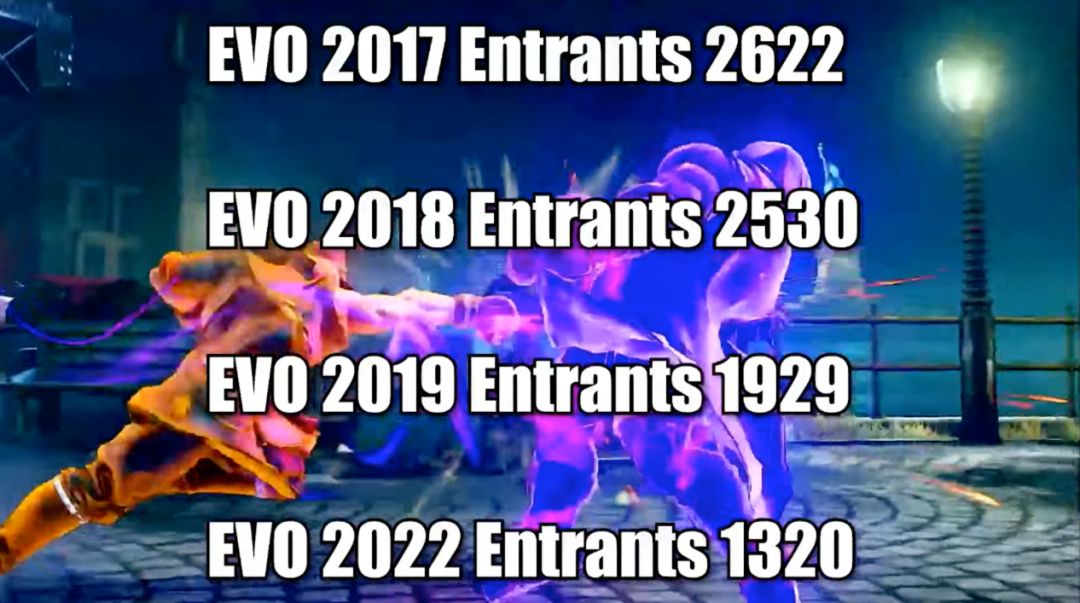被誉为格斗游戏的殿堂的世界级年度比赛EVO,最经典的「街霸」项目的参赛人数逐年下滑,从2017年到2022年,《街霸5》的参赛者下跌了一半。其中,当然也有疫情的一部分原因,但最重要的因素仍然是——热衷格斗游戏的人,越来越少了。