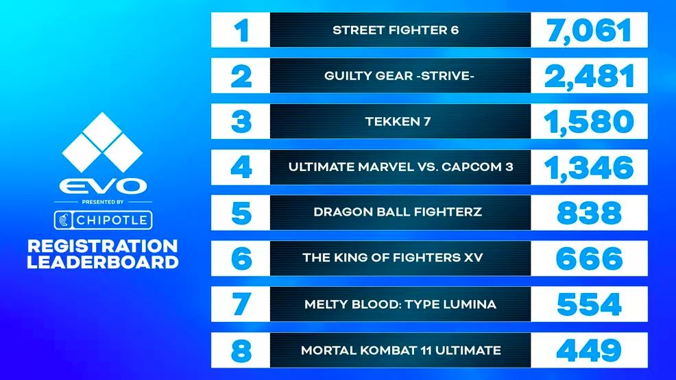 而在「街霸6」发售后两个月,EVO 2023的「街霸6」项目参赛者超过了惊人的7000人,几乎比其他所有项目的人数加起来还要多。这个数字也是前一年「街霸5」的参赛人数5倍多。