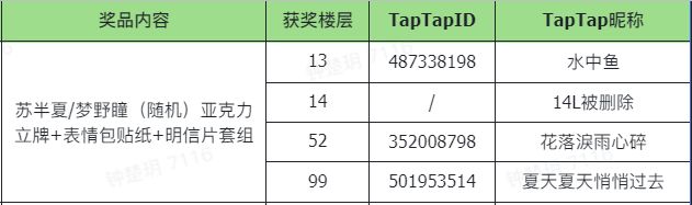 感谢各位社员们在七夕佳节的热烈回应,现根据盖楼特定楼层的获奖规则,恭喜以下13、52、99L的幸运小伙伴获奖~由于Tap论坛存在“发布回复后删除而楼层仍被占领”的问题,即原本回复的22L、23L被删除以后,下面的回复不再有22、23L而直接显示24L,本次活动的14L就是发生了该情况,因此严谨起见,此次14L抽奖资格作废。